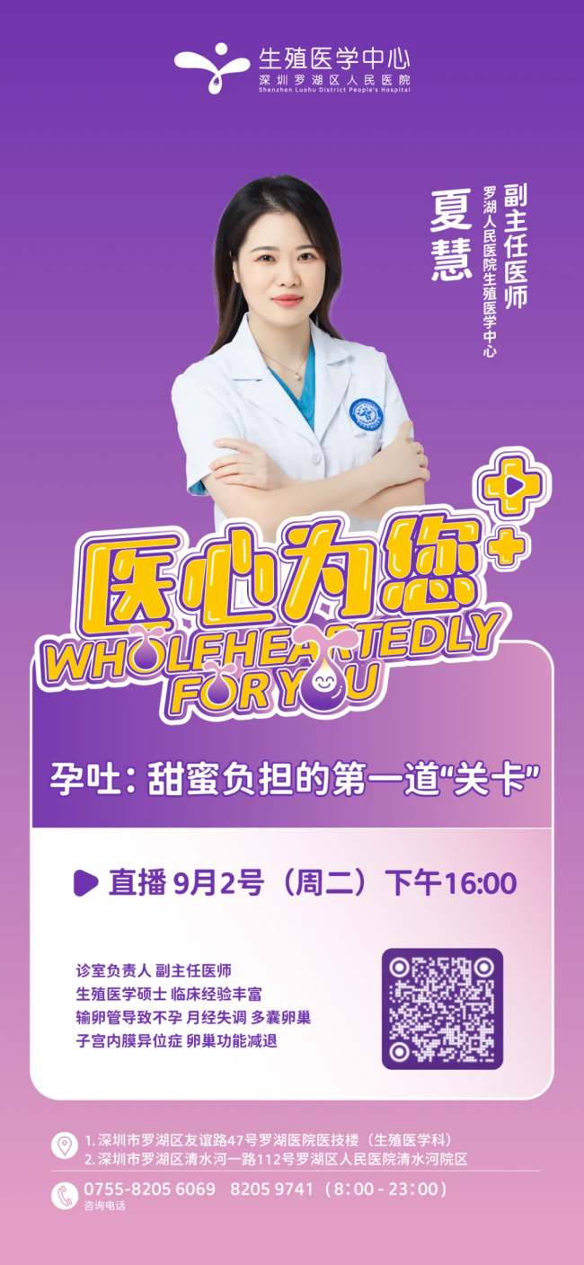 9月2日(星期二)16:00—17:00,特邀生殖医学中心夏慧主任给大家讲解《孕吐:甜蜜负担的第一道“关卡》。扫描下方二维码,即可预约观看。直播后半段还有答疑环节,欢迎大家前来参与线上提问~