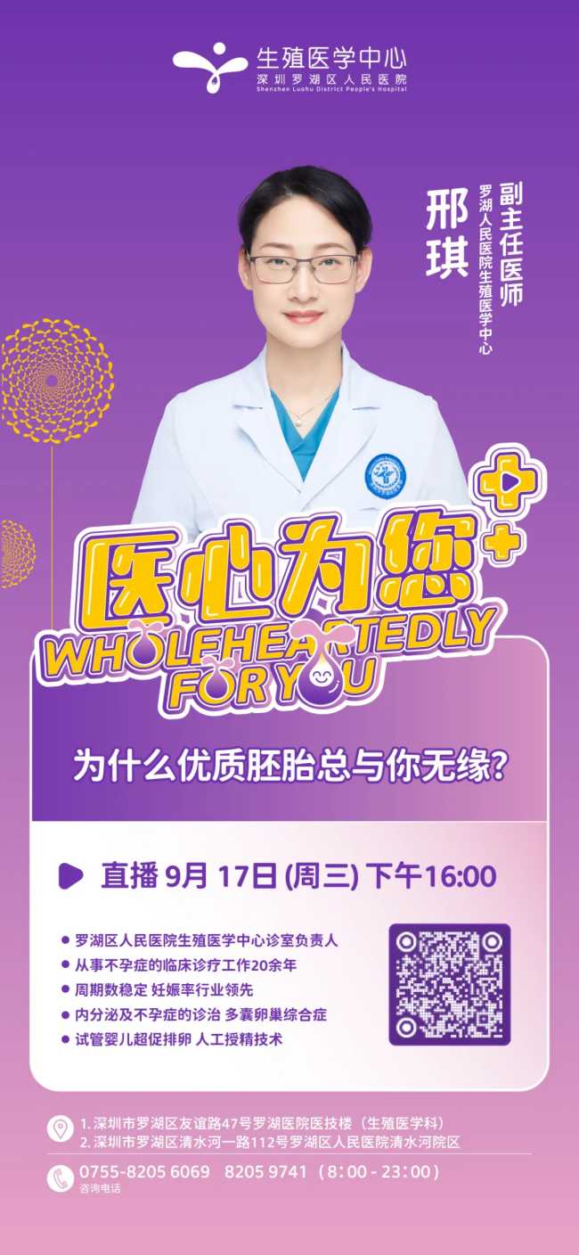 9月17日(星期三)16:00—17:00,特邀生殖医学中心邢琪主任  给大家讲解《为什么优质胚胎总与你无缘?》。扫描下方二维码,即可预约观看。直播后半段还有答疑环节,欢迎大家前来参与线上提问~