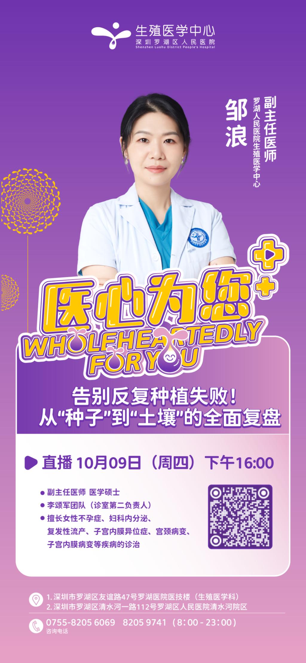 10月9日(星期四)16:00—17:00,特邀生殖医学中心邹浪主任家讲解《告别反复种植失败!从“种子”到“土壤”的全面复盘》。扫描下方二维码,即可预约观看。直播后半段还有答疑环节,欢迎大家前来参与线上提问~