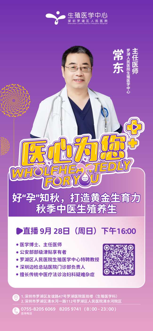 9月28日(星期日)16:00—17:00,特邀生殖医学中心常东博士给大家讲解《好“孕”知秋,打造黄金生育力—— 秋季中医生殖养生》。扫描下方二维码,即可预约观看。直播后半段还有答疑环节,欢迎大家前来参与线上提问~